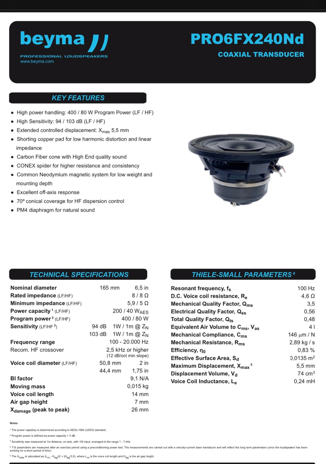 - BEYMA PRO6FX240ND COAXIAL SPEAKER INCLUDES A 6.5" IN A CAST FRAME WOOFER & A LIGHTWEIGHT NEODYMIUM 1" EXIT HF COMPRESSION DRIVER