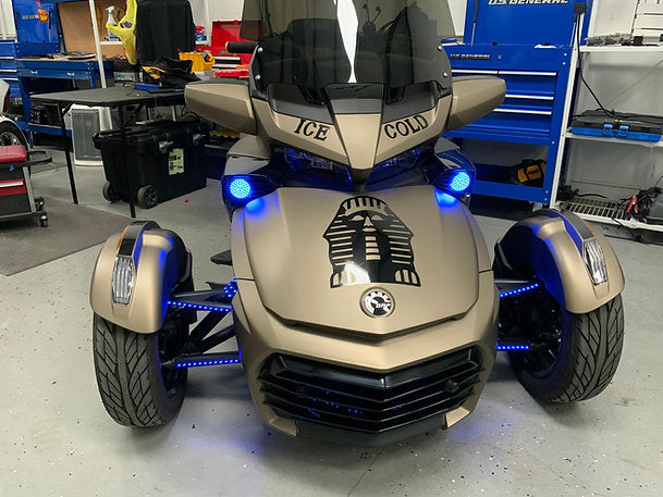 The superior designers at the Lite The Nite LEDs design center have outdone themselves with this new exclusive product. These exclusive Hypno Chase Halo Lights put mesmerizing circular pattern on the front of any Can Am F3. These hypnotizing halos have single color, multicolor modes, with over 200 preset chase patterns. And that’s not all, shock and amazed spectators as your entire bike flashes strobes and chases to the beat of your music, all of these dynamic functions are already built into our kits and requires no additional hardware or funding.