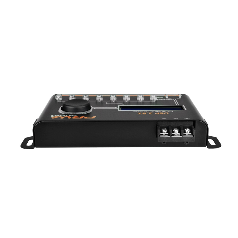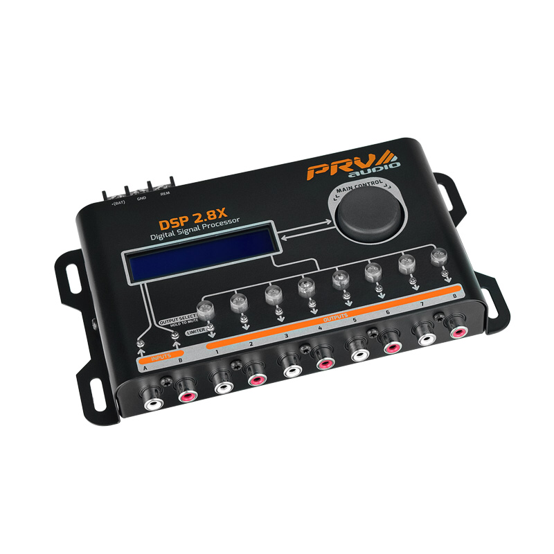 real-time audio adjustments.The DSP 2.8X features 2 audio inputs (A and B) and 8 independent outputs, and allows you to choose the audio source (A, B or A + B) for each output. It has an integrated equalization system, with 15-band graphic equalizer, manual tuning or through 12 presets (Flat, Loudness, Bass Boost, Mid Bass, Treble Boost, Powerful, Electronic, Rock, Hip Hop, Pop, Vocal and Pancadão).