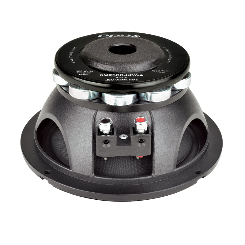 The PRV Audio Pro Audio Loudspeaker, 6MR500-NDY 6MR500-NDY-4 and midrange woofer offers outstanding durability and a smooth full range response through 12,500kHz. This woofer is perfect for home Hi-Fi installs, including bookshelf, satellite, surround sound speakers and even the home studio monitors. It is a great option for three way cabinets requiring additional midrange support.