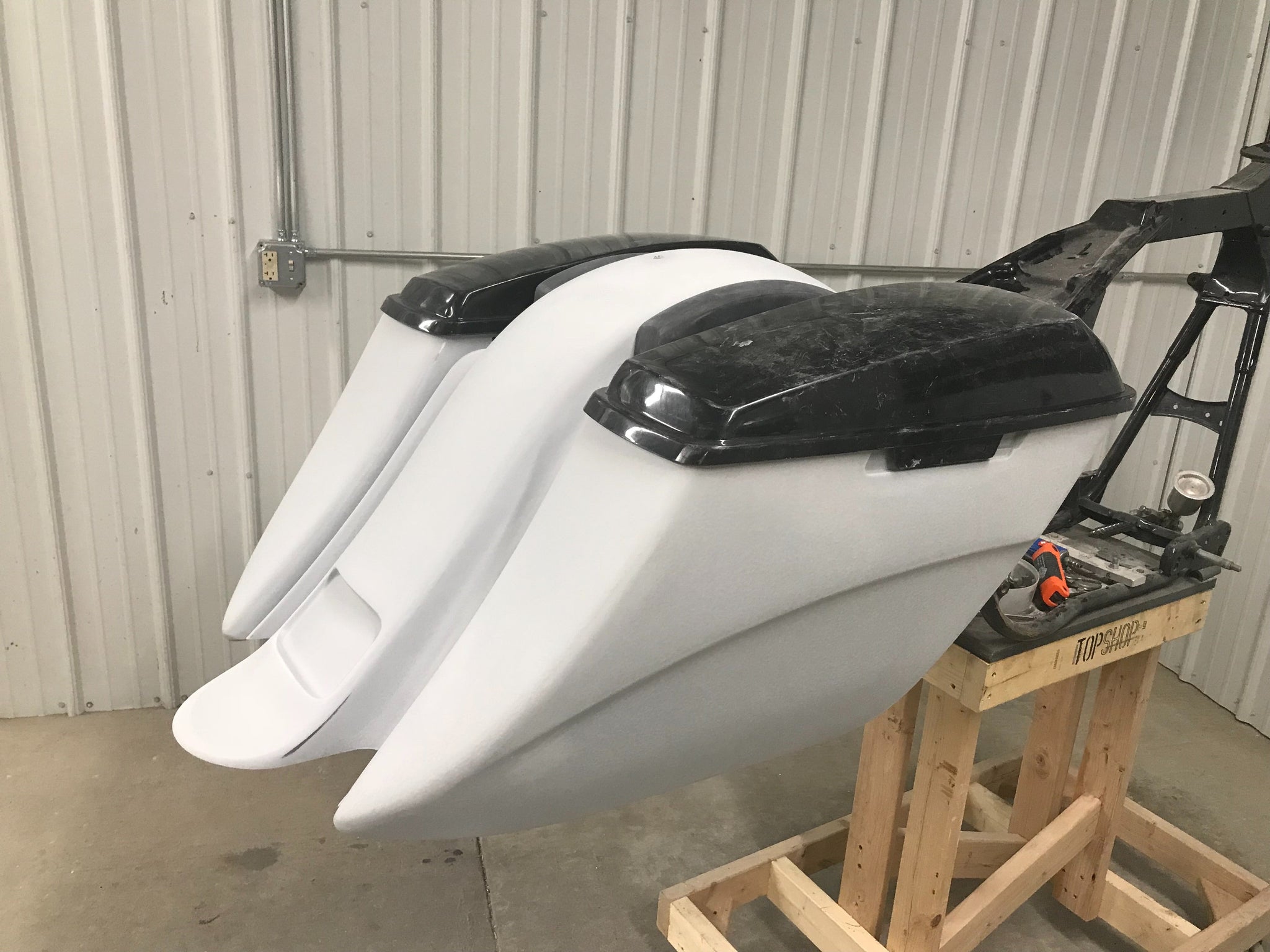 5.5″ down and 7.5″ back kit includes 14-16 bags, fender,14-16 side covers, plate frame, 14-16 OEM style lids and hardware, strut covers this kit would require air ride Exhaust options would be side exhaust or a 90 degree turn down bags are carpeted, with 2 coats of primer, only thing to finish before paint is wet sand. Bags and fender are pre drilled.