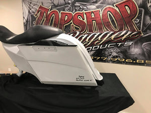 Our 2009-2013 Harley touring newstyle Viper 4.5” cvo kit. All our parts are designed and manufactured in house by Topshop mitchell,sd USA our kits are vacuum infused composite that is super ridged and strong and will withstand hot temperatures in summer with no Shrinking or getting. our parts are offer primed only and bags are finished inside with a industrial carpet! If you are looking for painted kits contact our paint dealer(the factory match . Com)Our kits come with our new super bright cvo lights that everyone will see you and our lights can be cleaned or get chemicals on lens without melting them like our cheap brands! New style kit includes: Bags, fender, side covers, plate frame, lights w/harness