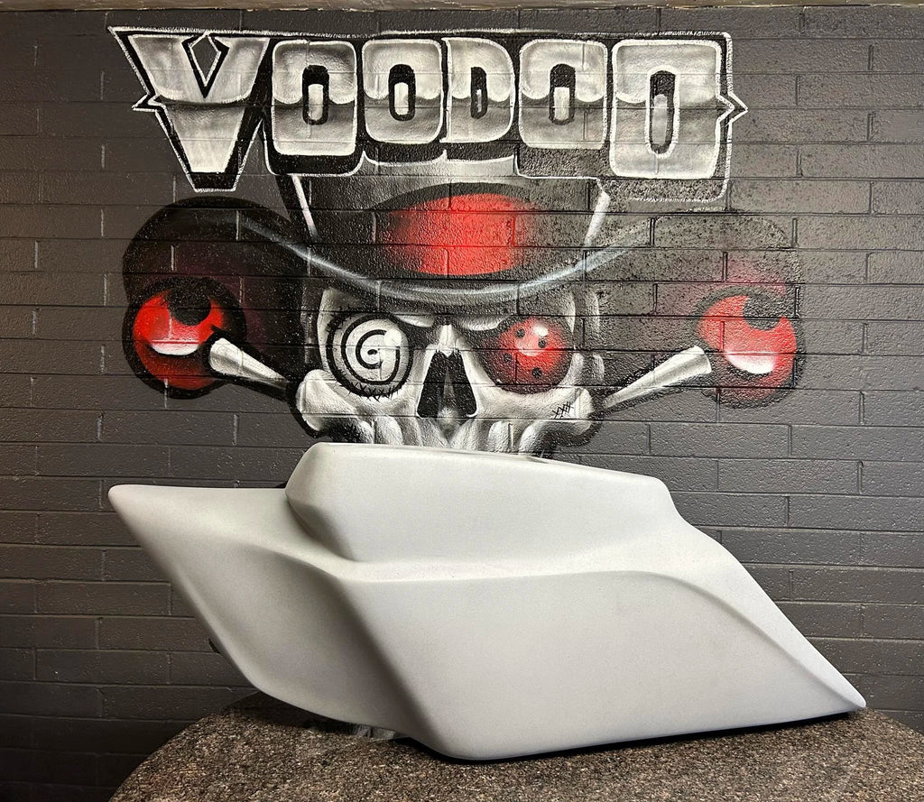 This is our Voodoo Wraith ELITE© (FLAT TOP) SERIES Rear End Kit!! The bags now will come with sidecovers part of the bag and the lid now holds 1- 8" and 1-CT440 or multiple bullet tweeters! The bag can hold 1- 10” in each saddlebag. These bags are 5” down and 9” out, off of OEM bags.