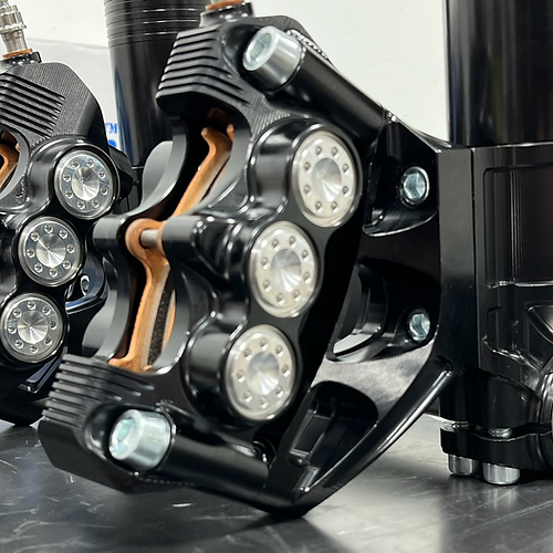 - 6-piston brake calipers CNC machined from billet aluminum