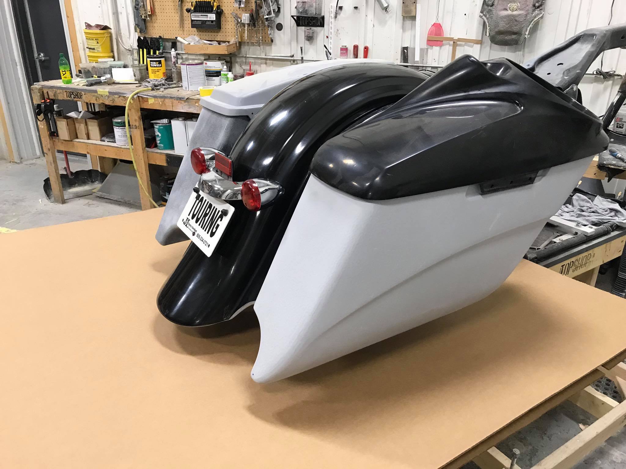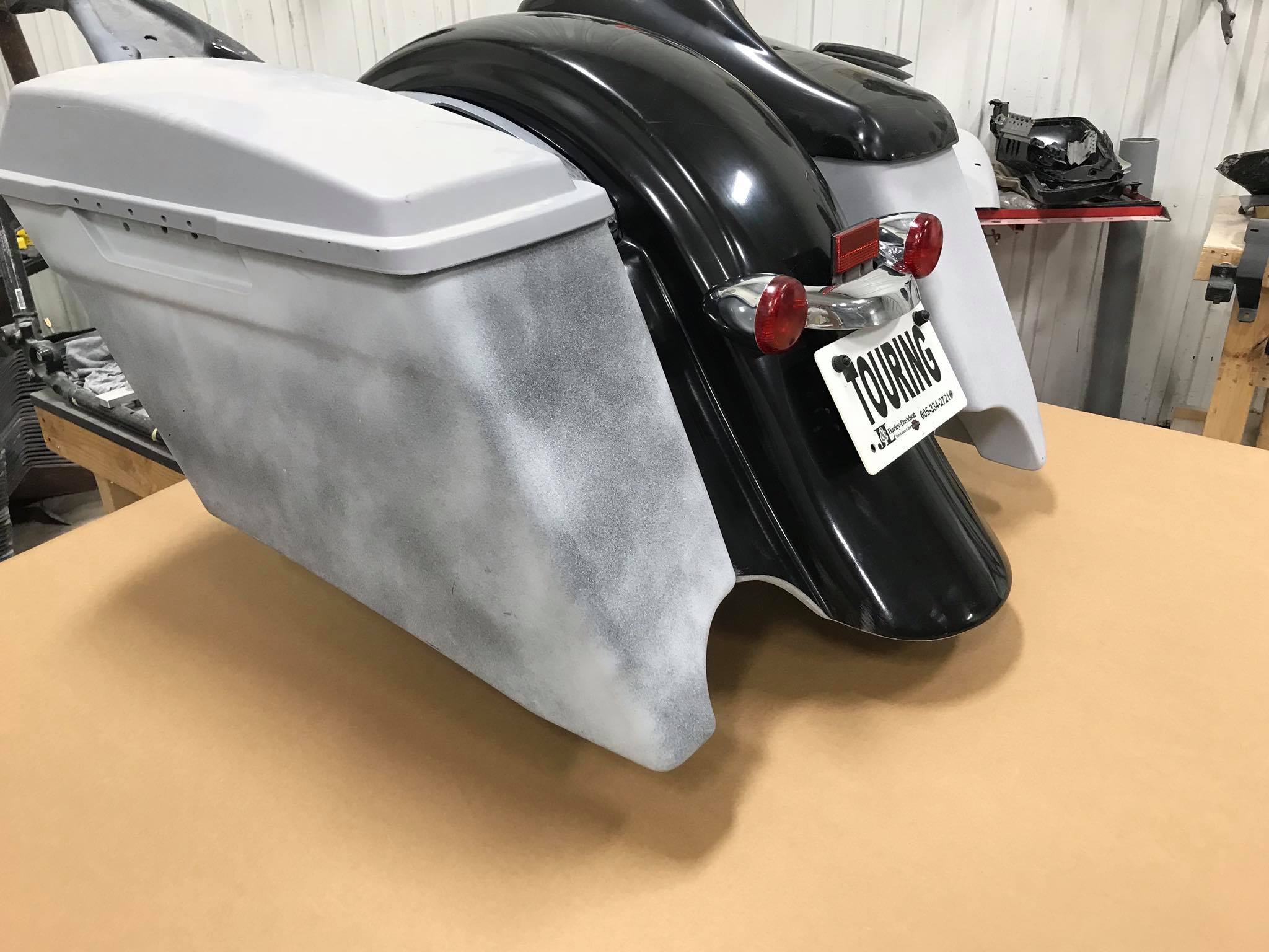 2009-2019 Harley touring ( new money kit)! This kit is our entry level package kit! Comes with our 322 bags, our brand new (new money) rear replacement fender that uses your stock light bar and plate frame, comes with our new pop on side covers! Bags are carpeted everything is primed and our parts are built in house 100% USA  you can get these bags in duals, right side and no exhaust cutouts! This new money fender does fit stock and stretched Harley bags nicely