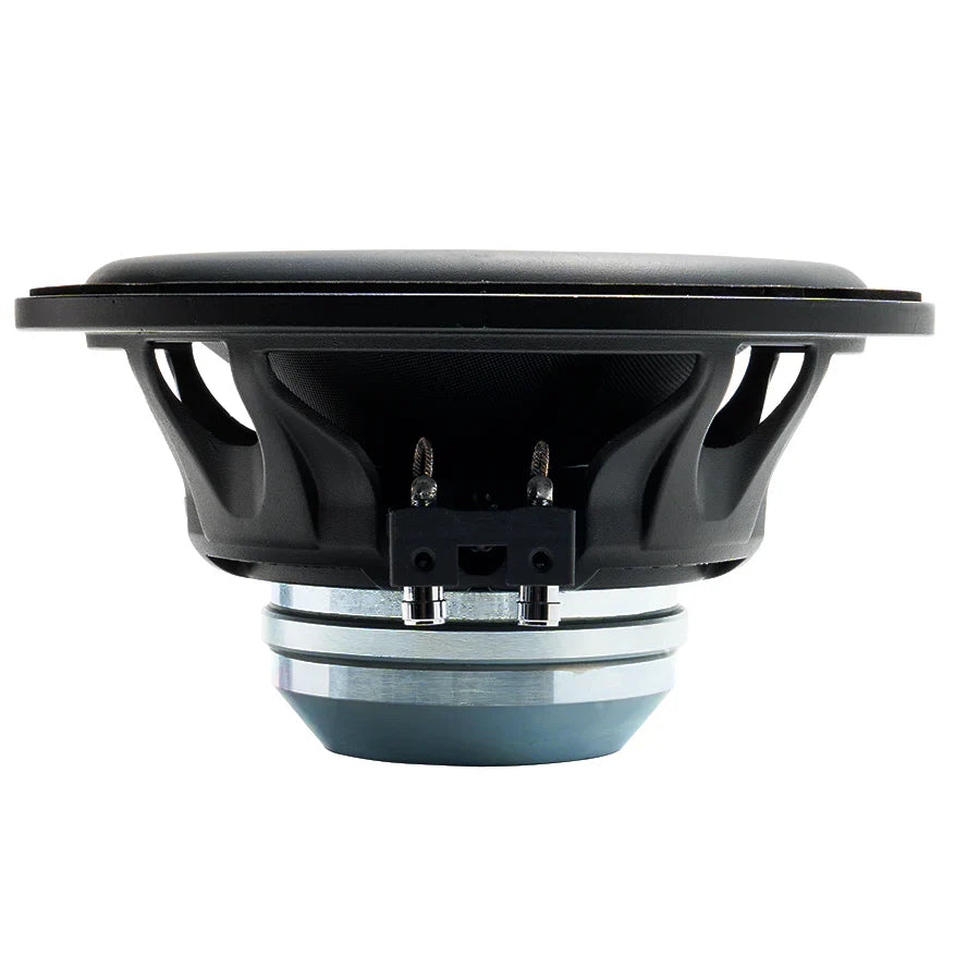 The XPERT EX8NMB-CFv2 carbon fiber midbass driver features a redesigned single-ring N52 neodymium magnet and a proprietary aluminum die-cast basket, reducing its mounting depth for tighter installations. Its carbon fiber construction enhances outdoor durability. The motor was designed to have an extended bandwidth that makes it easy to pair with higher-frequency drivers such as midranges and tweeters.