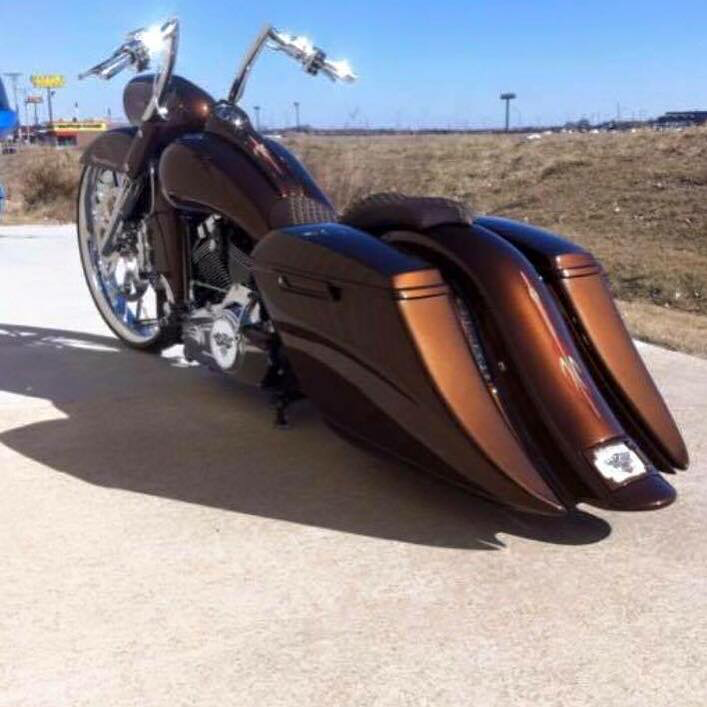 7.5″ Stretch, 14″ Sweep kit includes the Bags, Fender, Side Cover, Plate Frame All Bags come primed and carpeted All parts are vacuum infused with a high end resin, oven cured at high temp These bags are made to ride, the floor boards hit the ground before the bags do All parts will need to be sanded smooth before painting, no other prep before painting This kit is recommended for bike that have air ride and also 30-36 inch tire on the front Please allow 2-3 weeks when your order is placed, all of our products are made by hand.