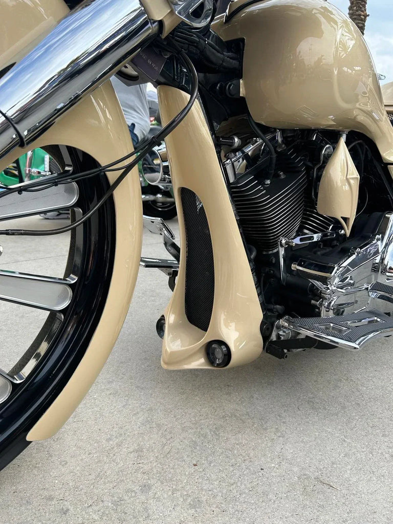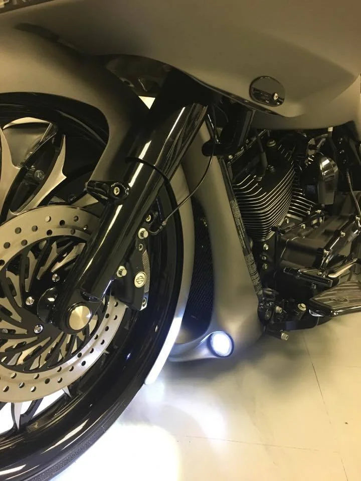 It's finally here! Our Performance Series© Chin Spoiler fits over the fat new oil cooler on the late model touring bikes. This is the only chin spoiler on the market that has the option for true 2" LED driving lights. Not only do they improve your visibility, but they also give your bike a badass look to stand out from the rest!